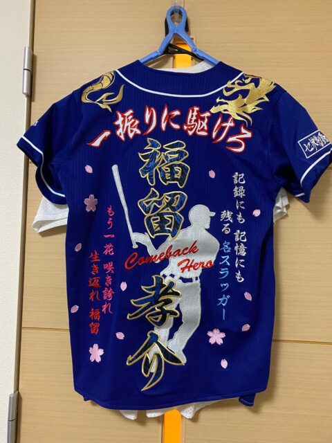 Ver.6竜 今までにないデザインで、2021年New!!!登場(*^▽^*)早速ご注文いただきました🎵14年ぶりにドラゴンズ復帰した、福留選手!!の応援刺繍ユニフォームが完成しました。特大背ネームの間に「Comeback Hero」と目立つように刺繍し、シルエットとのバランスが最高にカッコイイですね(^_-)-★