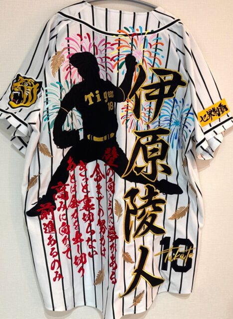 伊原陵人選手が先発した試合を何度か球場で見て惚れ込んでしまい今後、経験を積んでタイガースを背負っていく投手になって欲しいと期待しての応援ユニフォームです!特大シルエット・特大背ネーム・応援メッセージ等でインパクトのあるユニフォームにしたかった!デザインは真野ししゅうさんお任せでお願いしました。仕上がりに大満足!!!