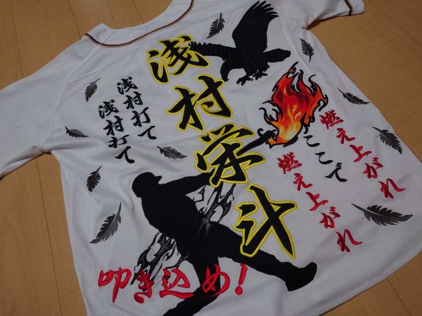 しん様 ご注文ありがとうございました😄🌟観戦で隣同士になった方から教えていただいたなんて素敵です🥹✨バットから炎が燃え上がるイメージが刺繍で綺麗に表現されていて、力強くかっこよく仕上がりましたね😍想像以上と言っていただけて嬉しいです🎵
