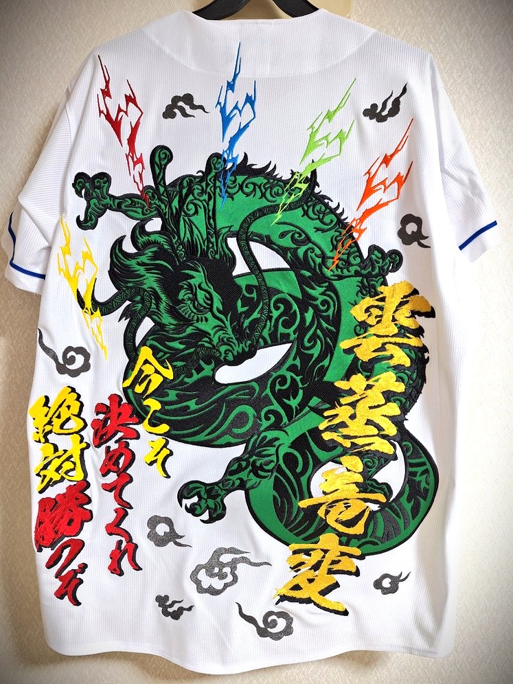 カリステ信者さま リピートのご注文ありがとうございます🐉🔥今回も気合の入ったユニフォームになりましたね!!😆グリーンのUZUMAKIに球団カラーの稲妻、極シャドー加工がオリジナリティ溢れるデザインになりました🌟来シーズンが楽しみですね💙これからもよろしくお願いします🐨💞
