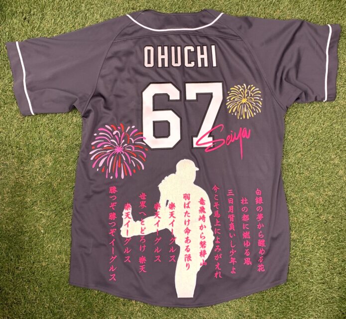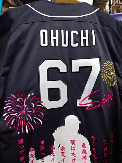 昨年のルーキーピッチャーで、まだ刺繍ユニフォームも少ないと思い、自分オリジナルで選手への思いを込めて依頼しました。ピッチャーなので、来季は先発ローテーションに入ってもらいたいという期待も願いも込めたユニフォームが完成しました♡シルエットが角度によってキラキラ光る加工になっているのも大満足♡私のお気に入りカラーの応援歌や名前の刺繍も最高です♡