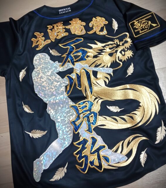 ドラファン様 ご注文ありがとうございました🐨💙ファンクラブユニフォームに刺繍したかっこいい一着に仕上がりましたね🌟オーロラ生地が黒ユニフォームに映えてとても綺麗です✨龍も少し薄めの金糸なのがいいですね🤗🎵