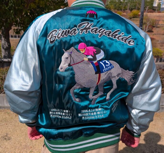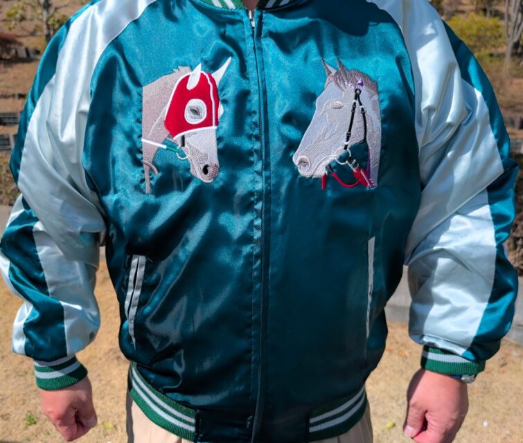 今回はスカジャンにビワハヤヒデの刺繍をしていただきましてありがとうございました。大満足な仕上がりで驚いております。素晴らしい宝物が出来ました。