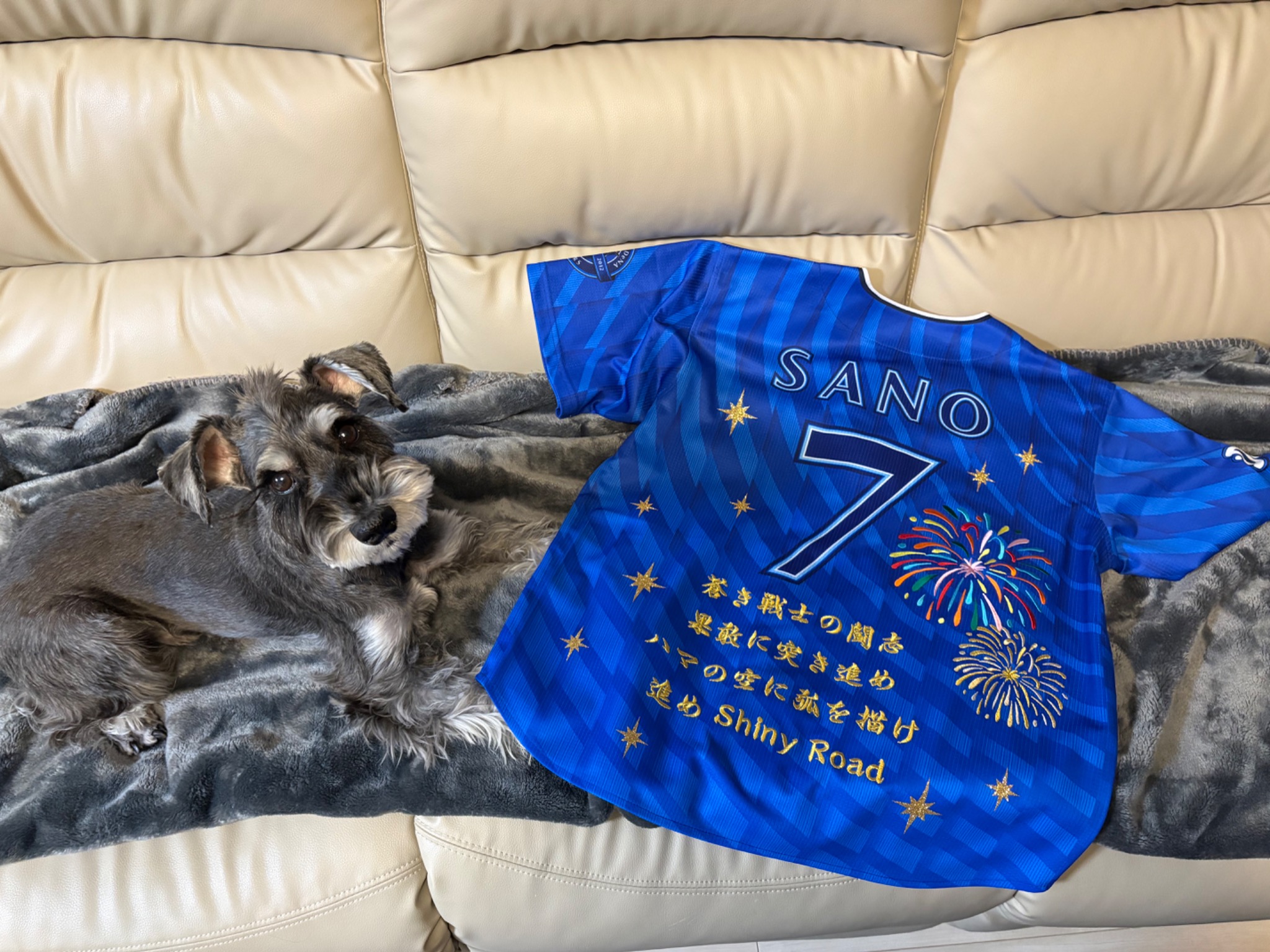 Beerさま 長いまつ毛が可愛いシュナちゃんとユニフォームの最高なお写真ありがとうございます💙応援歌の横書きいいですね✨英語が入る場合はオススメの配置です🤗仕上がりにご満足いただけて良かったです🌟